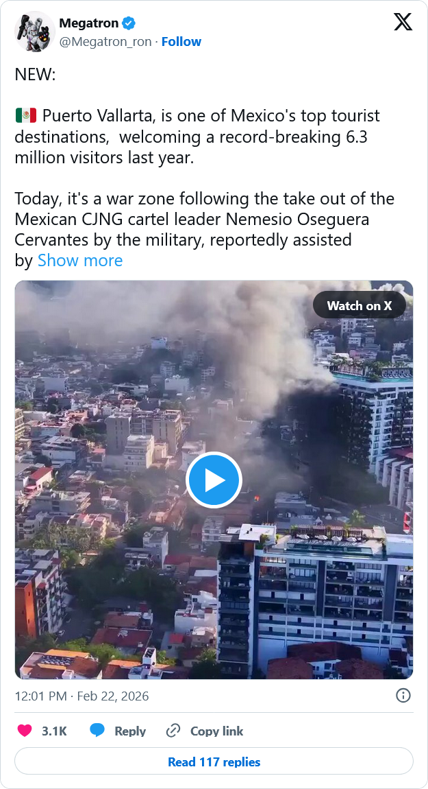 The Sunday killing of Nemesio "El Mencho" Oseguera Cervantes, the leader of Jalisco New Generation Cartel (CJNG), by Mexican security forces unleashed coordinated cartel retaliation attacks, driving rapid instability across Guadalajara (Jalisco's capital) and spilling into high-traffic resort areas, including Puerto Vallarta.